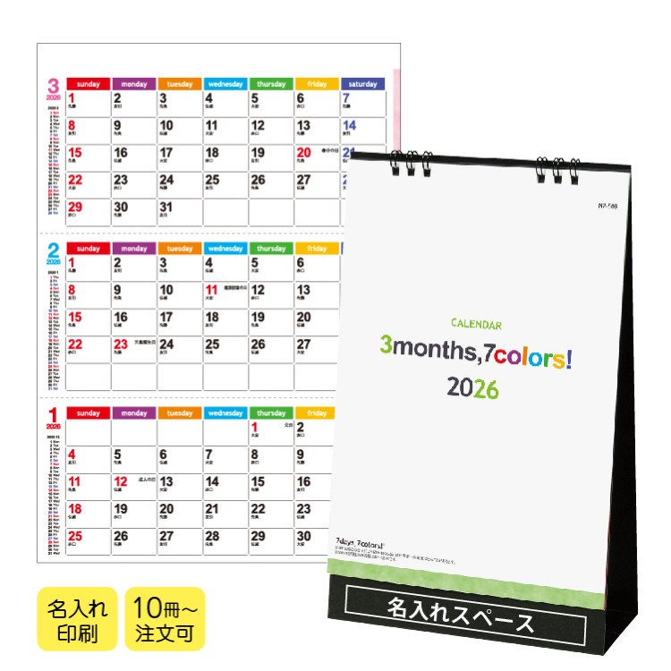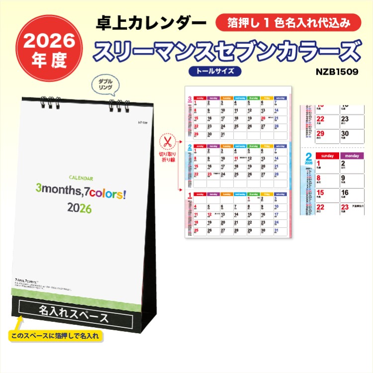 2026卓上 スリーマンスセブンカラーズ 名入れカレンダーの堂島広告![]() ![]() スリーマンスセブンカラーズ ![]() ページ(表) ![]() 六曜入り ![]() 仕様 ![]() 印刷色 ![]() フォント見本 ![]() 名入れ文字数 ![]() 梱包