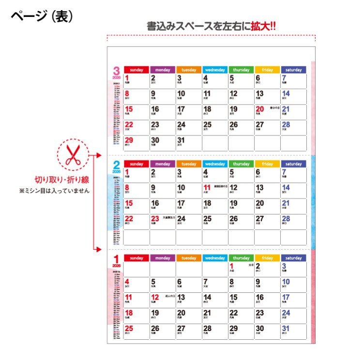 ![]() [印刷見本] 左から 白色 金色 銀色 ※2025年の画像を入れていますが、実際は2026年のカレンダーになります。