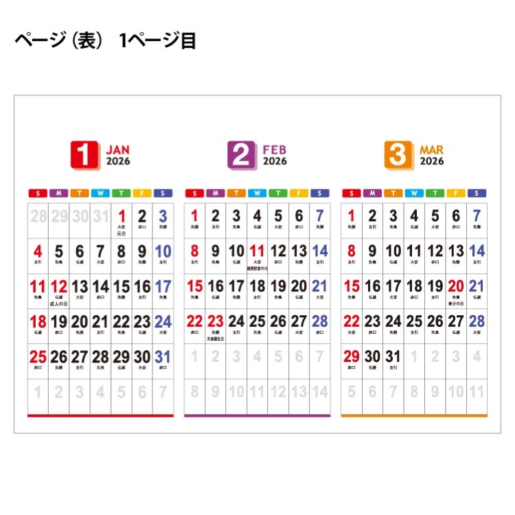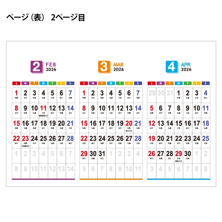 2ヶ月先までスケジュールが確認できる3ヶ月カレンダーです。また、6週表記にすることで先のスケジュール管理に便利です。 シンプルでカラフルなデザインは、オフィスやご自宅、店舗や病院の受付けなど、多くの場所に馴染みます。また、1週間を7色で視覚的に分けることで、予定や期限をすぐに把握し、時間管理を更に円滑にします。 どなたにも配りやすく、使いやすいとお声をいただいております。 |