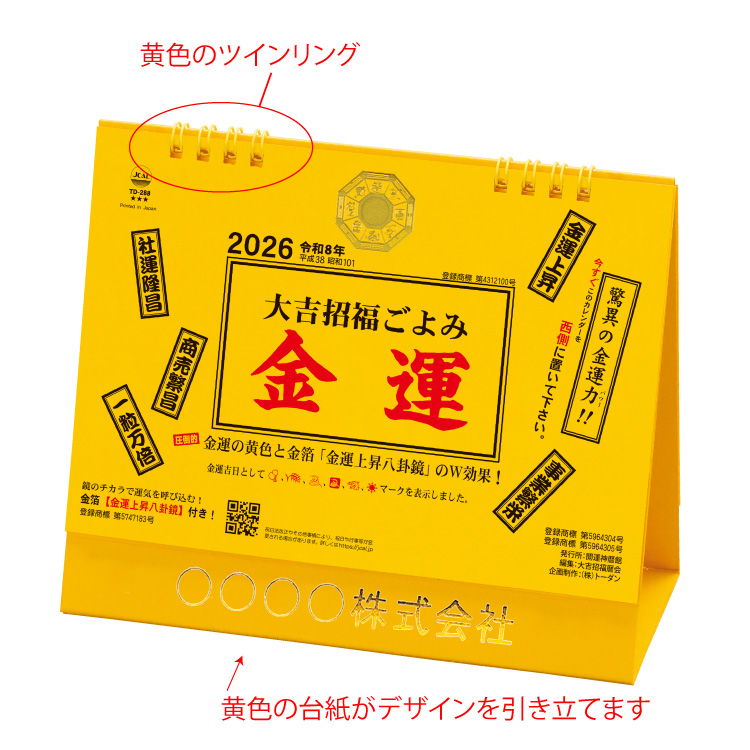 TD-288 卓上L・大吉招福ごよみ・金運は、金運アップをテーマにした人気の卓上カレンダーです。 黄色い台紙に金箔の「金運上昇八卦鏡」をあしらったデザインで、デスクに置くだけで存在感を放ちます。 |
