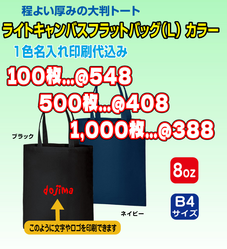 <ライトキャンバスフラットバッグ(L)カラー 1色印刷 価格表(税別)> 数量