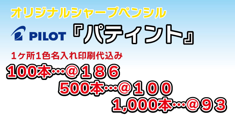 シャープペンシル・パイロット「パティント」1色名入れ代込み 100本・・@175円、500本・・@87円、1,000本・・@79円。 10万回はさんでもこわれない。パイロットが開発した開閉式「ソフトクリップ」は耐久性バツグン!こわれにくいから、いろんなところに挟んでも長く使えます。