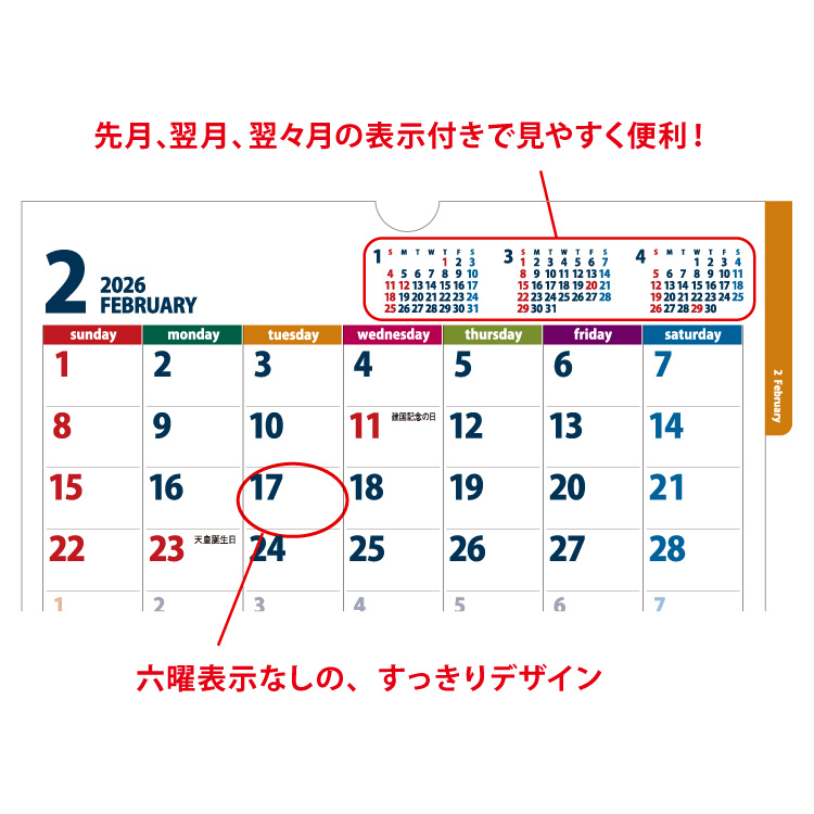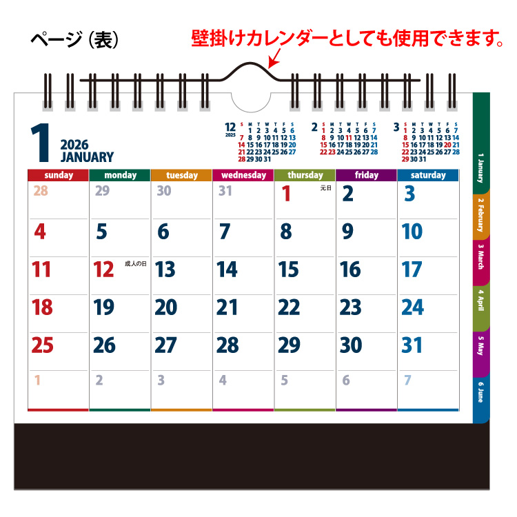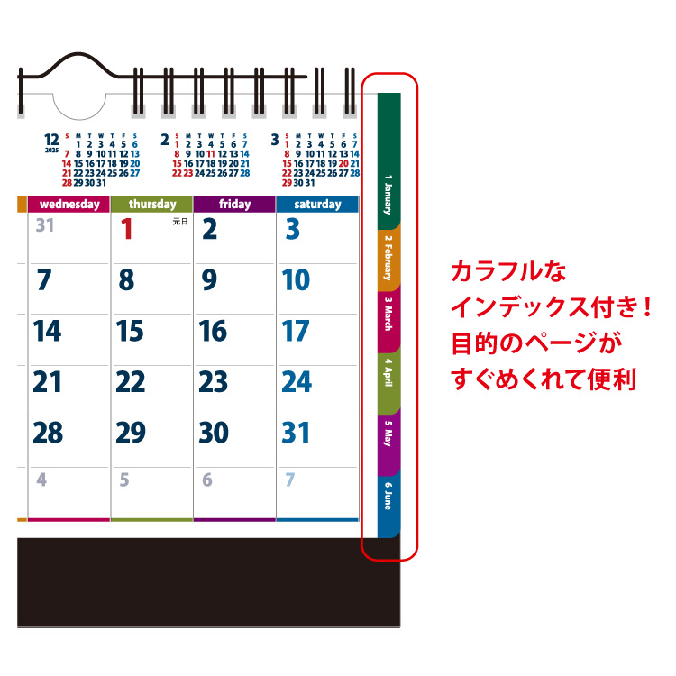 2026卓上 カラーインデックス・ビター 名入れカレンダーの堂島広告![]() ![]() カラーインデックス・ビター ![]() ページ(表) ![]() ページ(裏) ![]() 見やすい ![]() インデックス付き ![]() 付属ページ ![]() 仕様 ![]() 印刷色 ![]() フォント見本 ![]() 名入れ文字数 ![]() 梱包