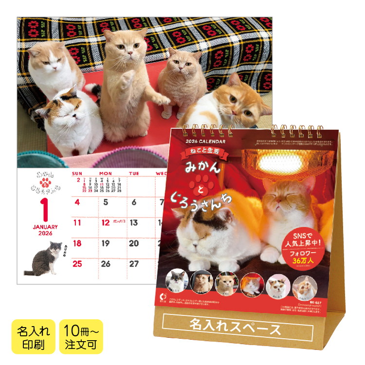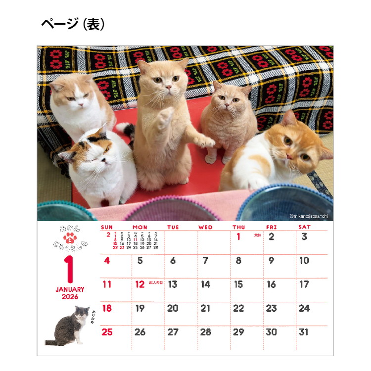 2026卓上 ねこと生活 みかんとじろうさんち 名入れカレンダーの堂島広告![]() ![]() みかんとじろうさんち ![]() ページ(表) ![]() かわいい写真入り ![]() 仕様 ![]() 印刷色 ![]() フォント見本 ![]() 名入れ文字数 ![]() 梱包