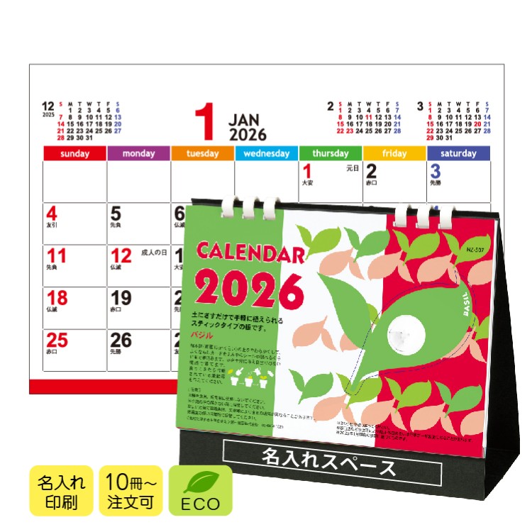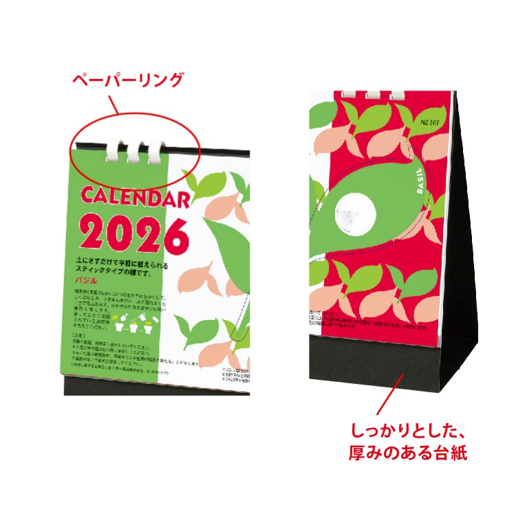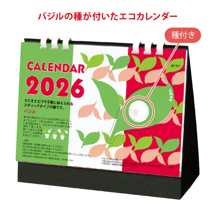 表紙にバジルの種が付いている卓上カレンダー「NZB1507 種付き卓上カレンダー(バジル)」。 ミシン目を簡単に切り取って土に挿すだけで、バジルを育てられます。 育てる喜びを感じられるこの独特なカレンダーで、日常に新しい楽しみを追加しましょう。 ![]() ハーブの王様とも呼ばれるバジルは、さわやかな香りが特徴で、イタリア料理、南フランス料理には欠かせない食材の一つになっています。 バジルの栽培は比較的簡単で、小さなプランターがあれば栽培できます。 ●種の蒔き時:3月〜8月 |
