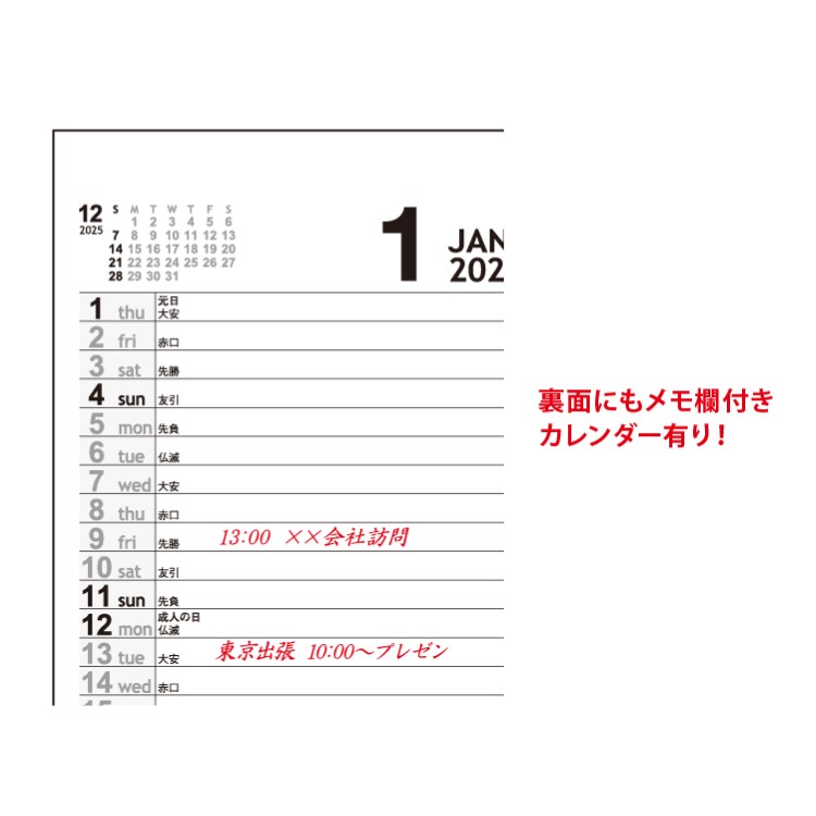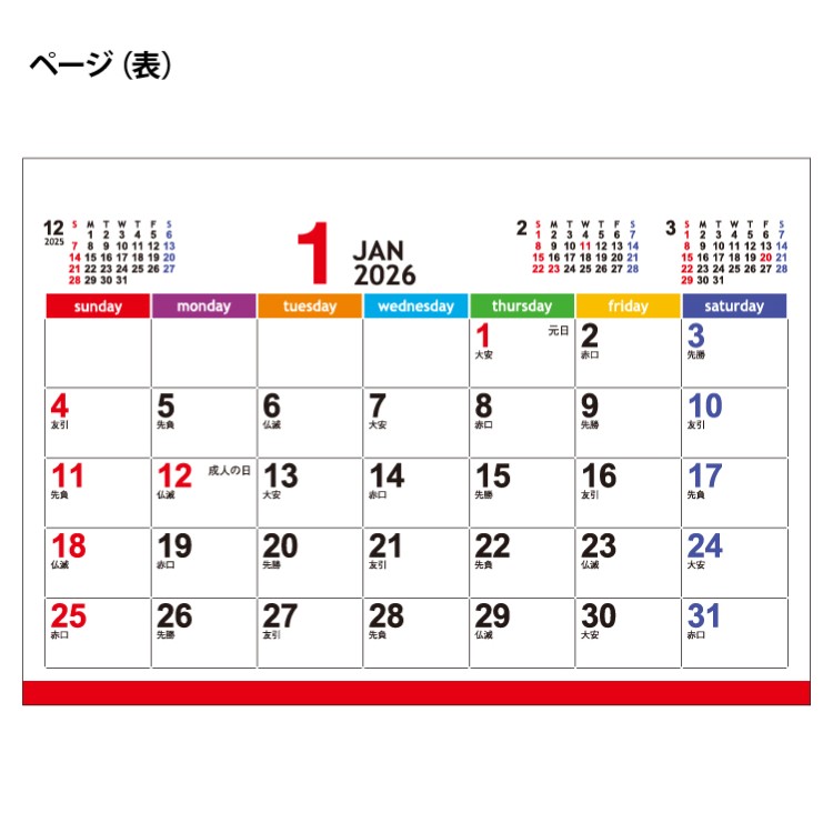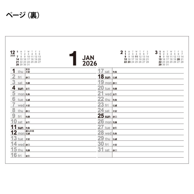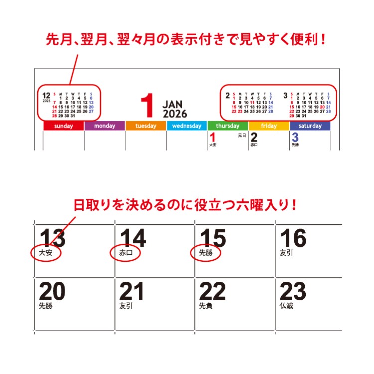 1. 環境に優しいペーパーリング使用 環境に配慮し、エコなペーパーリングを採用。 2. 先月・翌月・翌々月表示 3. 六曜入り 4. シンプルデザイン |