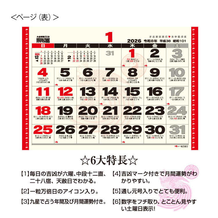 運気を呼び込み、幸せな一年を願う「開運カレンダー」の決定版! 「大吉」「招福」「除災」「運気上昇」といった縁起の良い言葉や伝統的なモチーフを散りばめた、和風デザインの卓上カレンダーです。 |