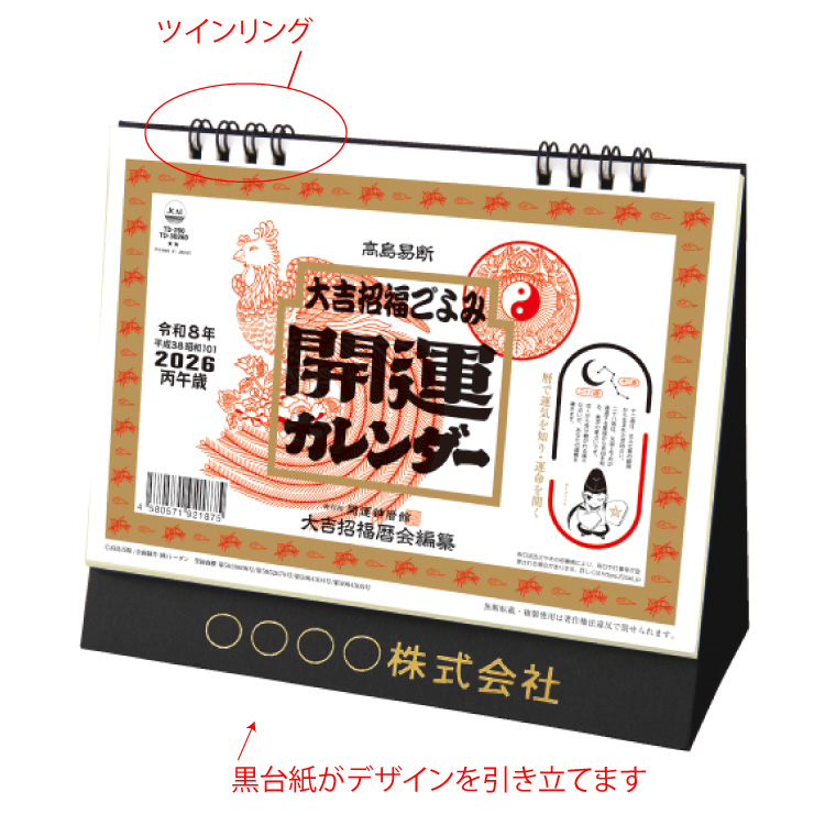 ・六曜・旧暦・二十四節気など、縁起を意識した暦情報をしっかり掲載 ・前月・翌月も確認できる便利な3か月表示 縁起の良いデザインと実用性を兼ね備えた「TD-260 卓上L・大吉招福ごよみ・開運」。 一年を通じてお客様や社員に喜ばれる、販促・記念品に最適な卓上カレンダーです。 |