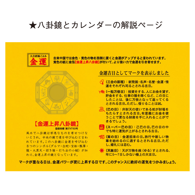 TD-288 卓上L・大吉招福ごよみ・金運は、金運アップをテーマにした人気の卓上カレンダーです。 黄色い台紙に金箔の「金運上昇八卦鏡」をあしらったデザインで、デスクに置くだけで存在感を放ちます。 |
